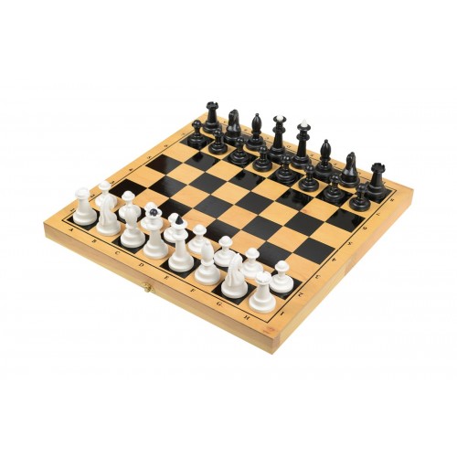 Складная шахматная доска изготовлена из дерева, фигуры - пластиковые, без утяжелителя, классического дизайна. Шахматная доска служит также коробкой для фигур, что удобно для транспортировки.